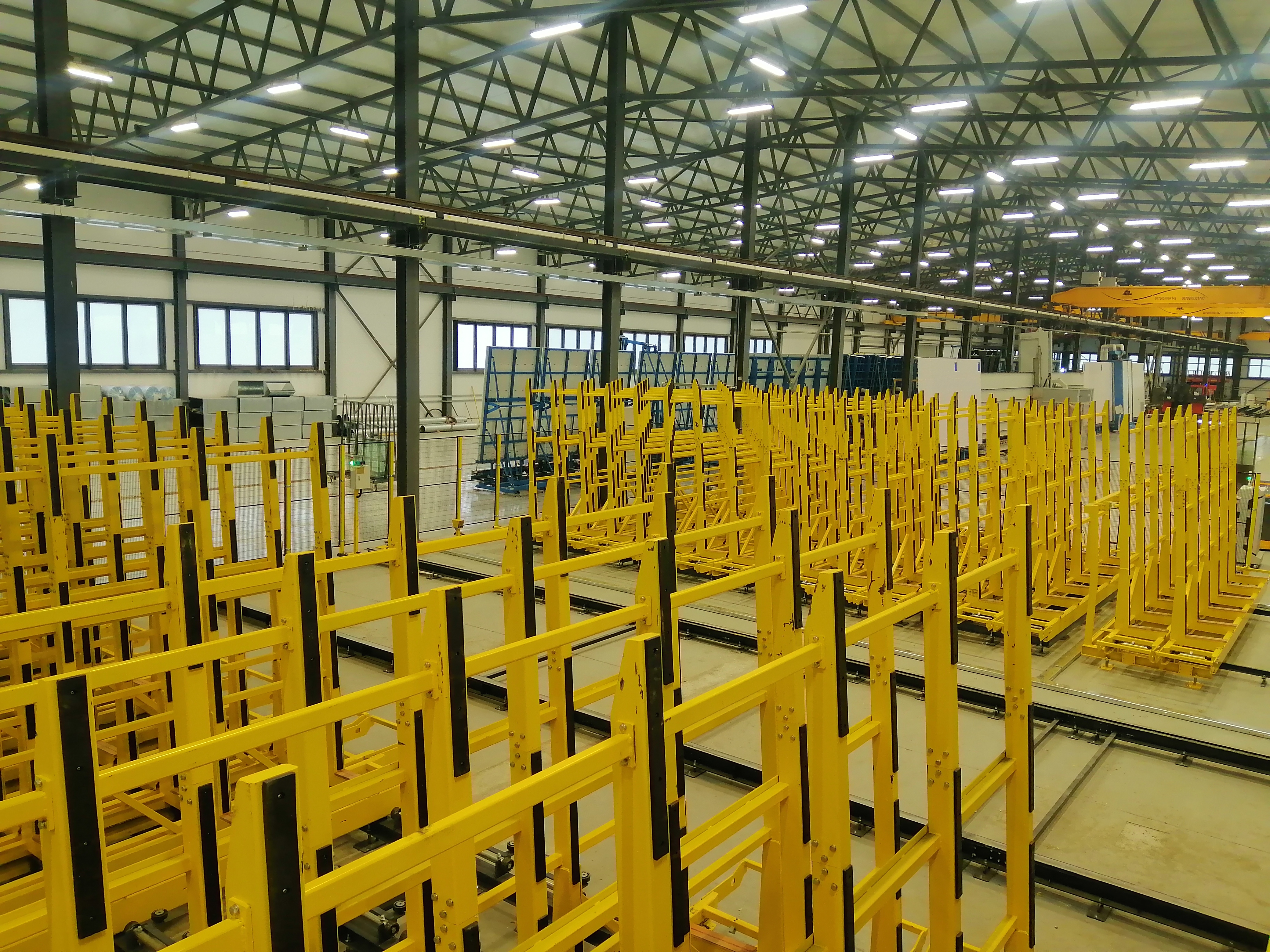 The shuttle system can automatically supply glass for loading table. There is a glass feeding station for float glass unloading from truck then the shuttle equipment will automatically send the glasses with the rack to the position that required by the control system. After getting the instruction from the control system, the glasses with the rack will send to the loading area of cutting line. All the glass data such as dimension, thickness and color will be input the database then all the information can be shared with the central control system. The whole system with high degree of automation and it is safe and reliable.